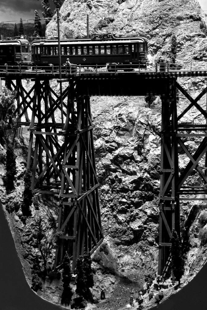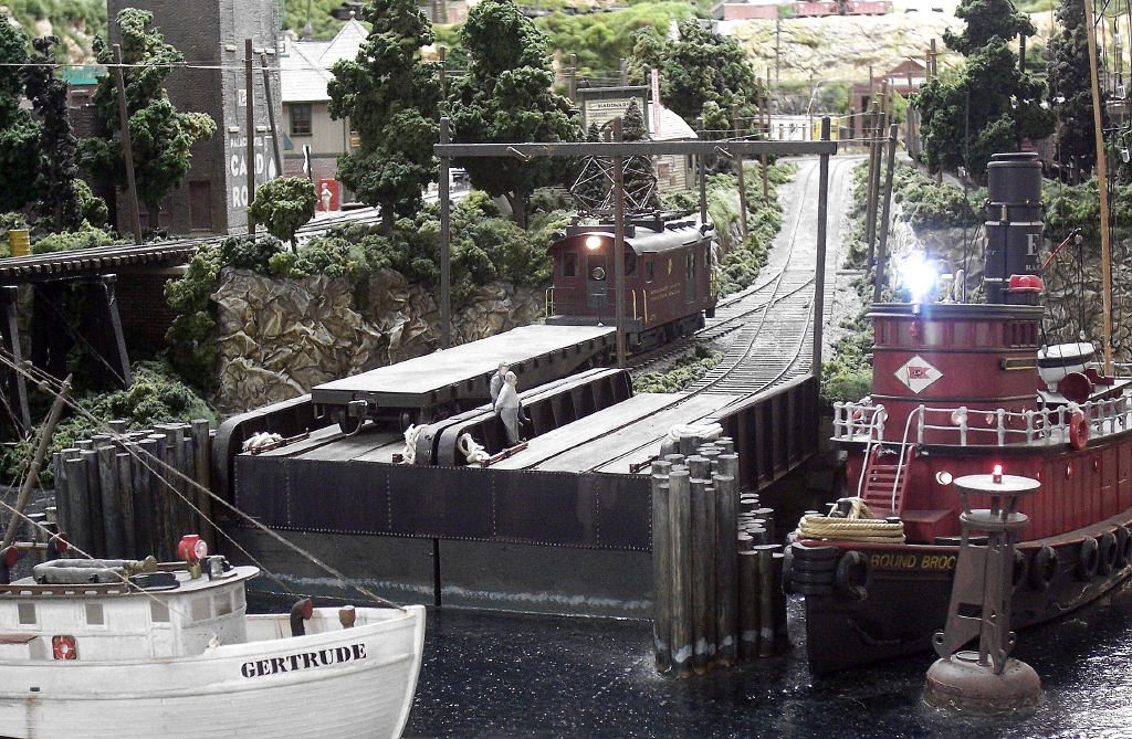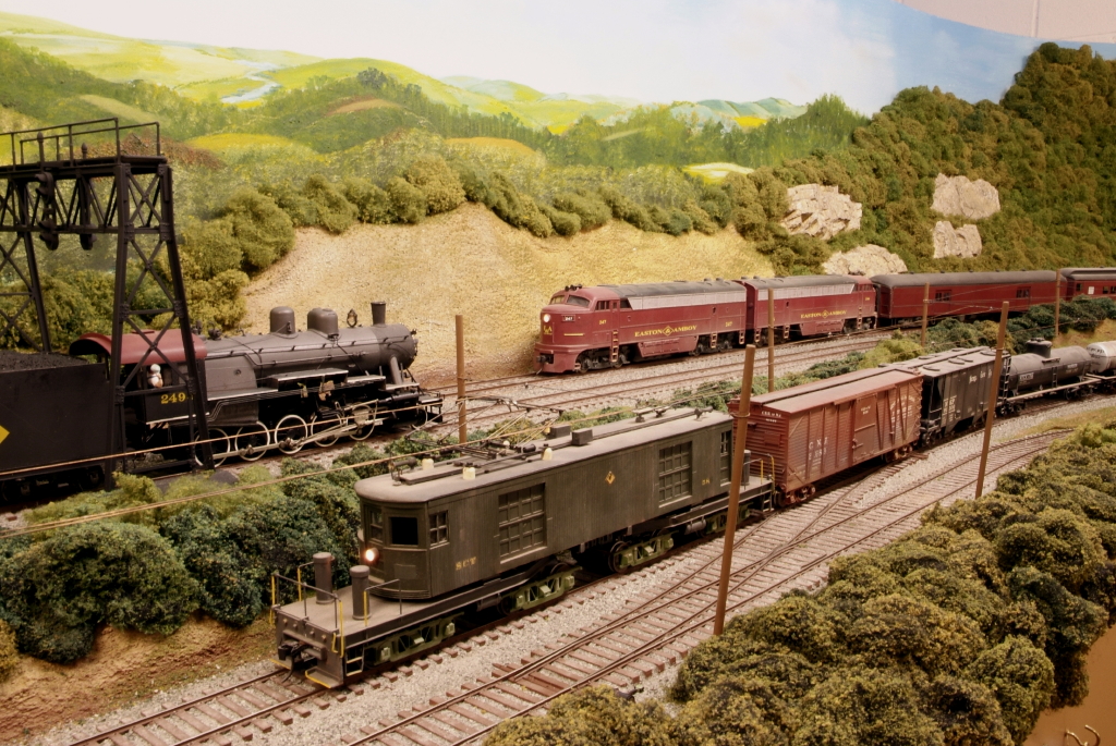 This is an O scale heavy-electric railroad with live overhead wire. The point-to-point design represents a “could have been” mostly-freight-hauling railroad. The line traverses north-central NJ from its eastern boundary’s edgewater in Newark Bay to its western boundary’s edgewater on the Delaware River and represents a distance of about 49 miles. In addition, there is an automated narrow gauge quarry operation feeding a branch line.